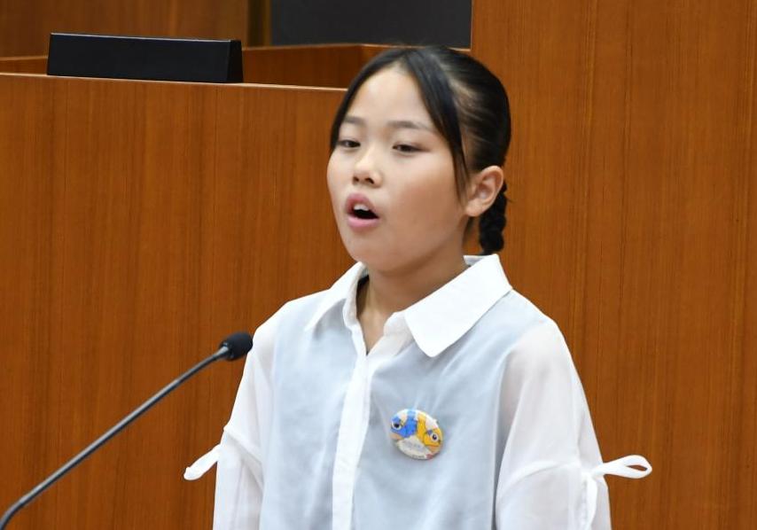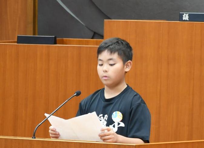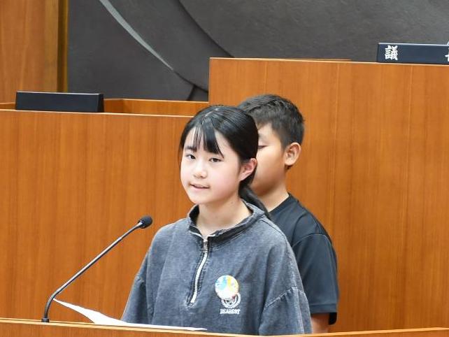 子ども議員は、壇上に立つと、緊張しながらも自分の考えを述べ、立派な質問ができました。そして市長と教育長も、子ども議員の真剣な思いに応えるため、丁寧に答弁を行い、子ども議員は真剣な面持ちで耳を傾けていました。